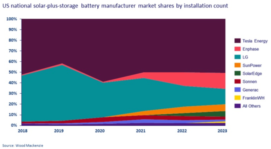 Wood Mackenzie发布的图表按安装数量显示了太阳能+电池公司的市场份额,突显了特斯拉在该领域的显著地位。从图中可以看出,到目前为止,2023 年安装的住宅电池中约有一半是Tesla Powerwall。