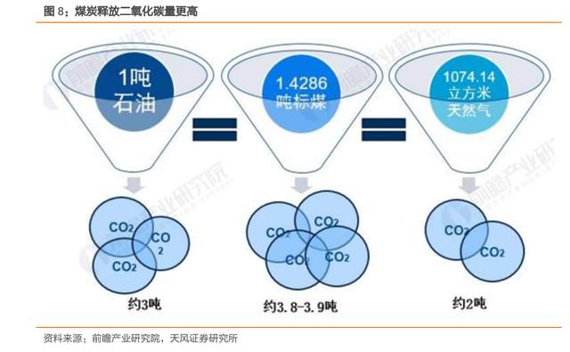 前瞻产业研究院资料显示,1 吨石油所产生的热量等于1.43吨标准煤产生的热量,等于1074.14立方米天然气所产生的热量。在产生相同热能量的情况下,燃烧煤所释放的二氧化碳远高于燃烧石油和天然气所排放的二氧化碳。