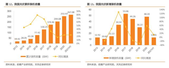 光伏新增装机量在经历531光伏新政影响后目前开始回升,2020年新增装机量48.2GW,同比增长59.5%,2021H1持续增长趋势,光伏发电新增装机13.01GW,同比增长12.93%。