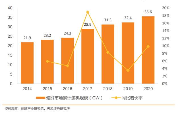 储能市场累计装机量持续增长。根据前瞻产业研究院援引CNESA数据,截至2020年底,中国已投运储能项目累计装机规模为35.6GW,占全球市场总规模的18.6%,同比增长9.8%,涨幅比2019年同期增长6.2个百分点。