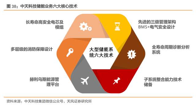 中天科技在储能业务具有六大核心技术,包括长寿命高安全电芯及模组、先进的三级管理架构BMS+电气安全设计、多层级的消防保障设计、全寿命周期诊断分析系统、赫利乌斯能源管理平台、子系统整合能力技术储备。