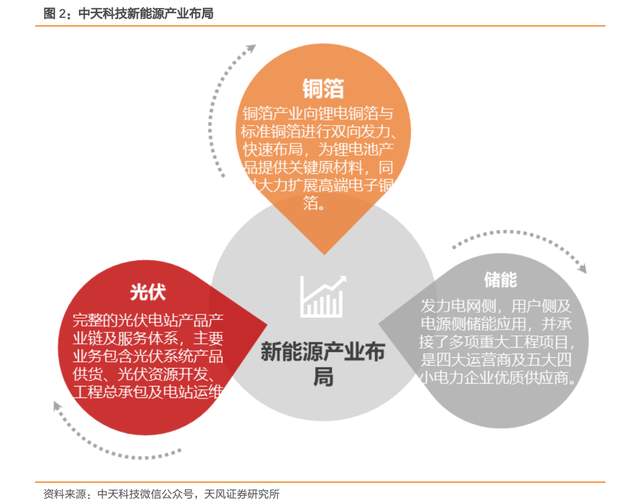 中天科技新能源业务主要涉足三大板块,分别为光伏、储能以及铜箔。