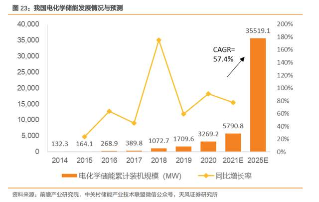 预计未来电化学储能将持续维持快速增长态势,至2025年累计装机规模达到35519.1MW,2021-2025年复合增长率为57.4%。