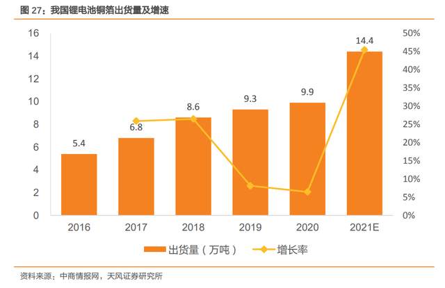 细分产品出货量来看,中国锂电池铜箔市场预计将迎来快速发展,受益于我国锂电池应用增多预计行业出货量将迎来增长,2020年锂电池铜箔出货量为 9.9 万吨,据中商情报网数据,预计2021年将达到14.4万吨,同比增长45.45%。