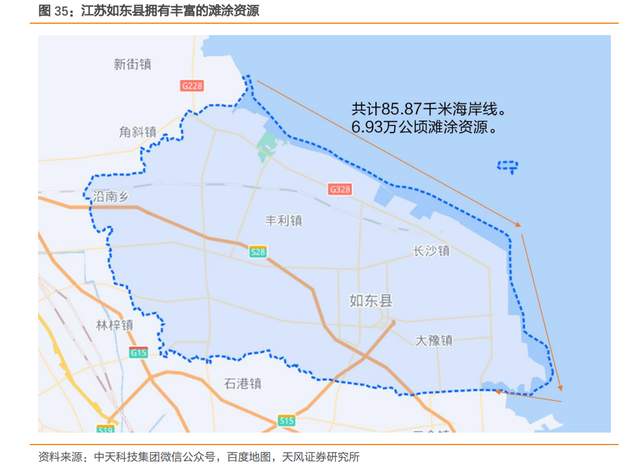 根据中天科技官方数据,如东拥有全长85.87千米海岸线,约占全省的1/9,滩涂资源丰富,可利用面积约为6.93万公顷。