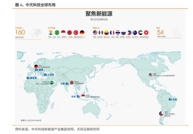 中天科技关注创新科技,聚焦新能源,在全球进行产品布局,拥有在印度、巴西等六地的海外工厂,同时在美国、墨西哥等10地具有营销中心、共设立54个海外办事处,具有国际化产品销售布局。