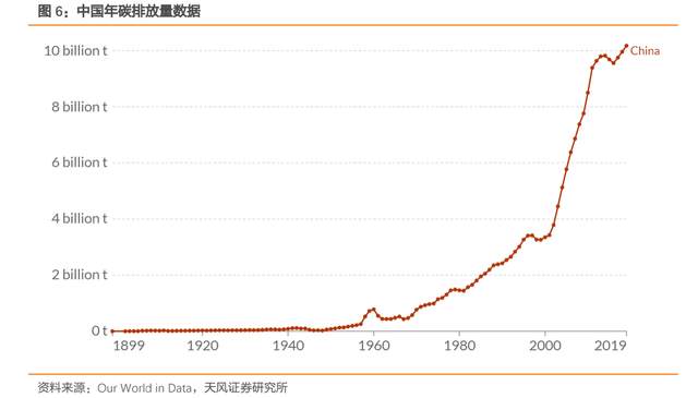 我国碳排放量改革开放后快速增长。根据Our World in Data数据,我国碳排放量在1949年建国时每年5936万吨缓慢上升至1978年约14.9亿吨,随后呈现快速增长态势,2000年后增速再次上升,2019年我国碳排放量已经达到104.9亿吨。