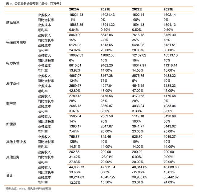 整体看,公司围绕通信+能源布局光通信、电力传输、海洋业务、新能源四大板块。其中: