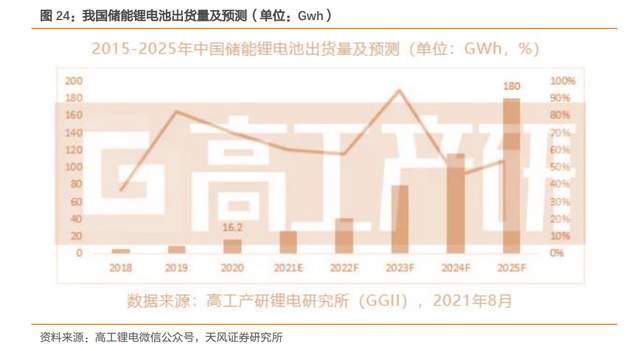 高工产研锂电研究所(GGII)预测,至2025年中国储能锂电池出货量有望达到180GWh,比2020年规模增长10倍以上,5年复合增长率超60%。