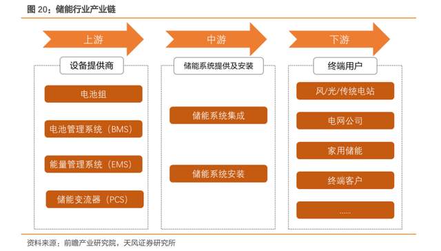 储能产业链情况。储能产业链中储能系统安装为关键环节,属于产业链中游。其上游包括电池、电池管理、能量管理系统以及储能变流器供应商,下游则为终端应用客户,包括风/光/传统电站、电网公司、家用储能等。