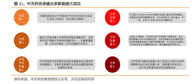 在将近10年的布局发展中,中天科技参与多项重大新能源项目的建设,包括承建我国首批18个国家级分布式光伏发电150兆瓦示范区工程项目、承建江苏省最大的单体商用锂电储能项目等。在这些国家级项目的承建过程中不断提升技术水平,积累项目落地经验。
