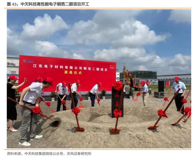 2021 年 7 月,中天科技旗下江东电子材料有限公司高性能电子铜箔二期项目正式开工奠基,该项目总投资 20 亿元,预计可形成年销售 24 亿元、年利税超 3 亿元。