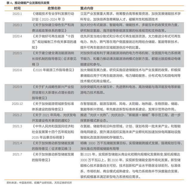 政策频繁出台推动行业发展。2020年以来,我国政府部门多次出台相关政策,致力于推动 储能产业与技术的发展,最新的《国家能源局关于加快推动新型储能发展的指导意见》指 出,至2025年,实现新型储能从商业化初期向规模化发展转变,装机规模达3000万千瓦以上;到2030年,实现新型储能全面市场化发展。