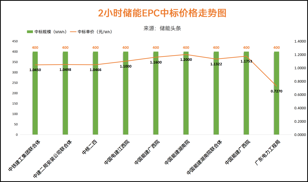 2小时EPC最低价为0.727元/Wh,由中国能源建设集团广东电力工程局有限公司在灵丘县200MW/400MWh独立新型储能电站项目EPC总承包中报出。