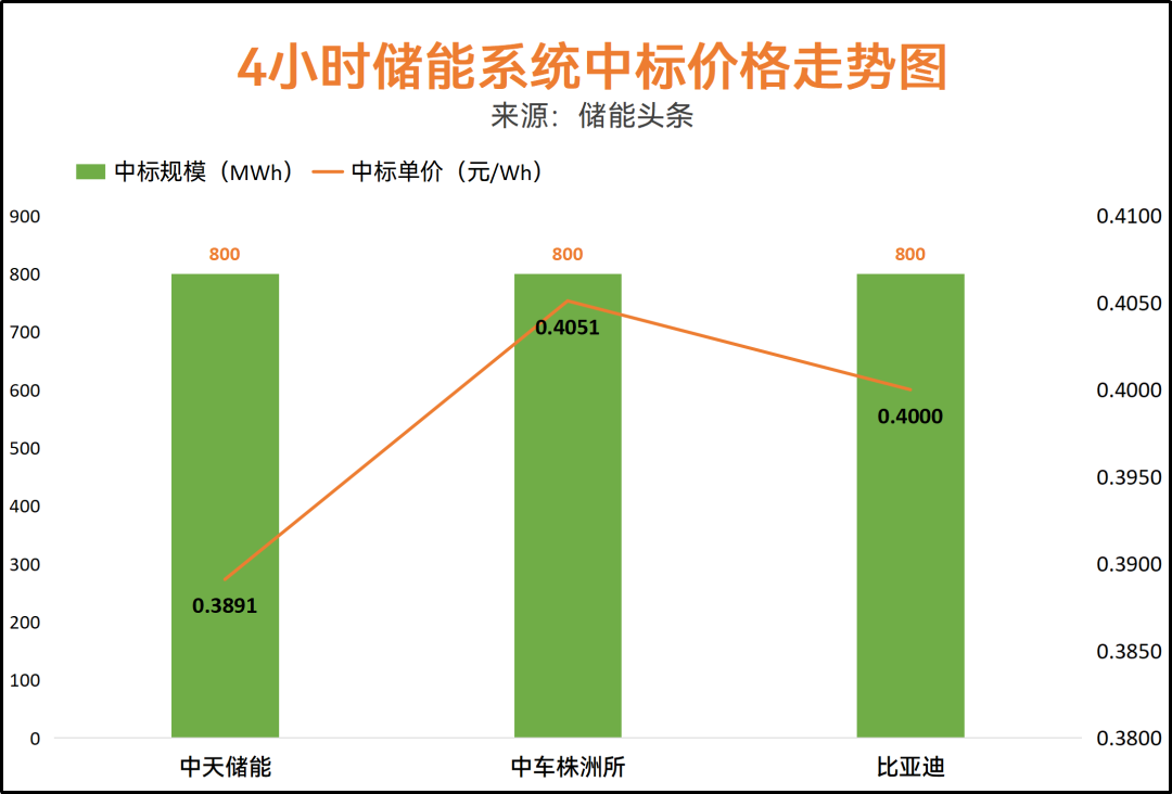 4小时储能系统项目招标有3个有效报价。报价在0.3891~0.4051元/Wh之间,均价为0.3981元/Wh。