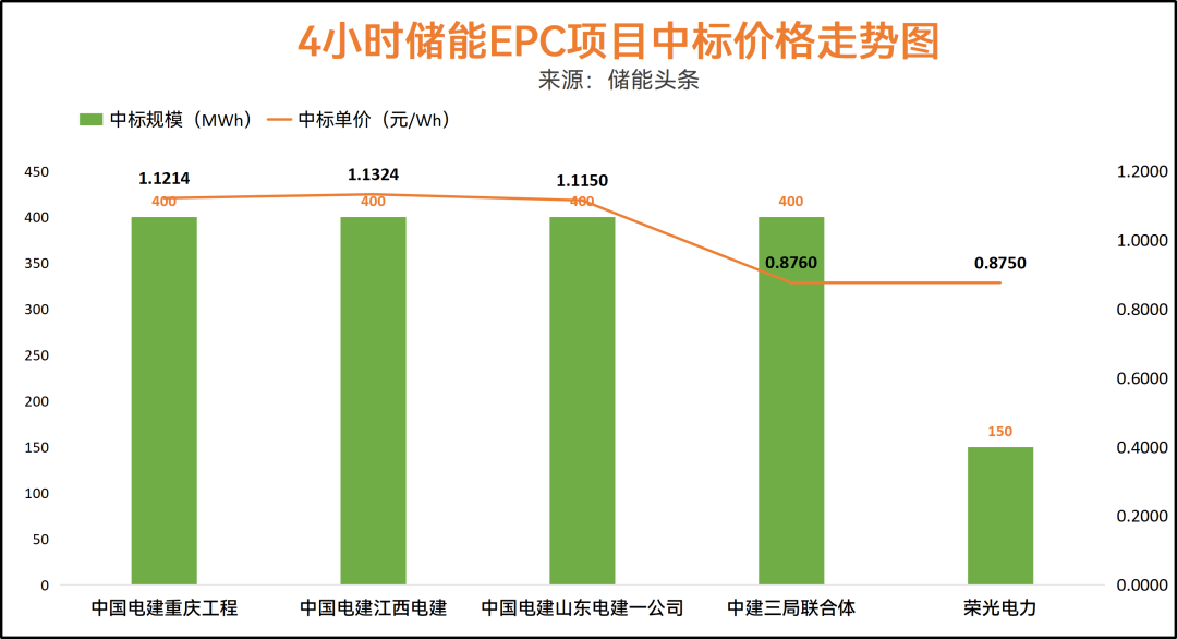 其中最低价为0.875元/Wh,由宁夏荣光电力工程有限公司在宁夏瀚骏新能源有限公司盐池县150MW/600MWh储能电站项目EPC总承包中报出。