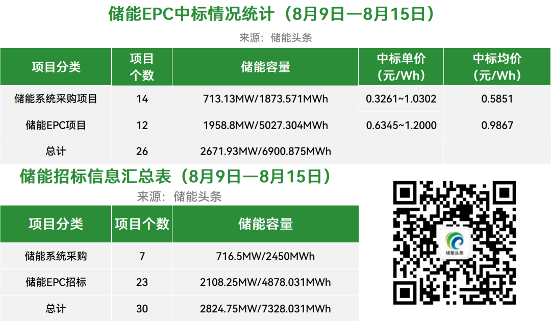 据储能头条对近期(8月9日-8月15日)储能系统与EPC招中标公开项目进行统计与分析。