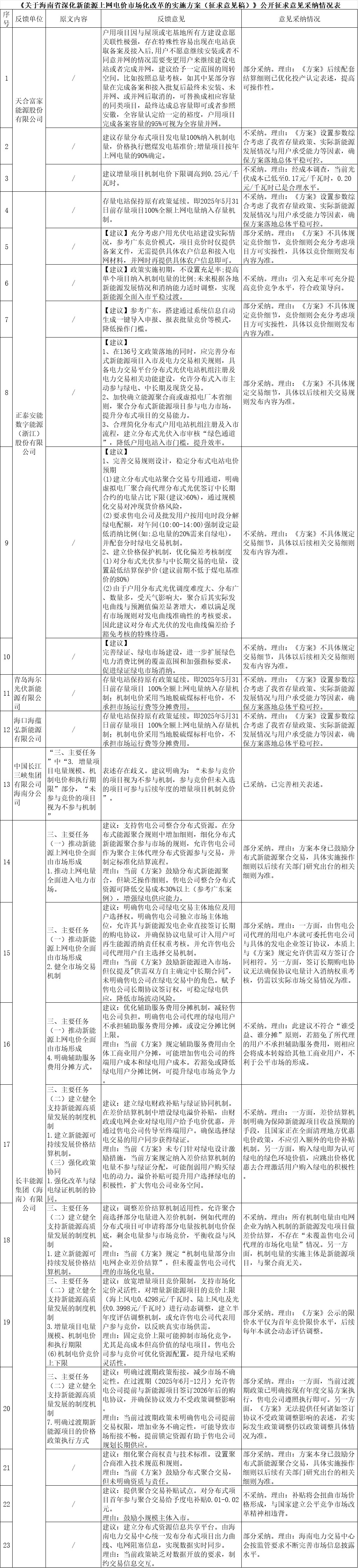 附件:《关于海南省深化新能源上网电价市场化改革的实施方案(征求意见稿)》公开征求意见采纳情况表
