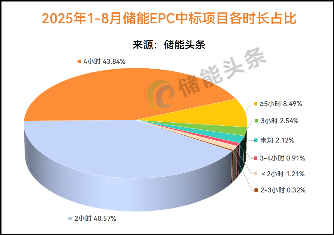 从储能时长来看,据储能头条统计,2025年1-8月储能EPC项目中,2小时储能仍然占据多数份额,占比约为43.84%,其次是4小时储能时长占比达40.57%,≥5小时储能占8.49%,3小时占2.54%。