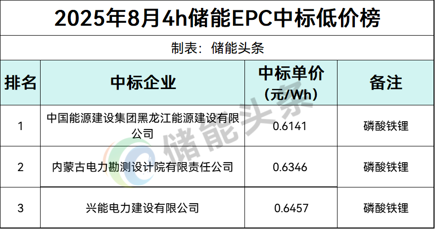 8月份,4h储能EPC项目中标低价Top3分别由中国能源建设集团黑龙江能源建设有限公司、内蒙古电力勘测设计院有限责任公司、兴能电力建设有限公司投出,投标单价分别为0.6141元/Wh、0.6346元/Wh、0.6457元/Wh。