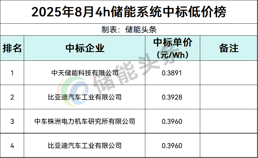 8月,4h储能系统采购最低价为0.3891元/Wh,4个较低报价分别由中天储能、比亚迪、中车株洲所报出。
