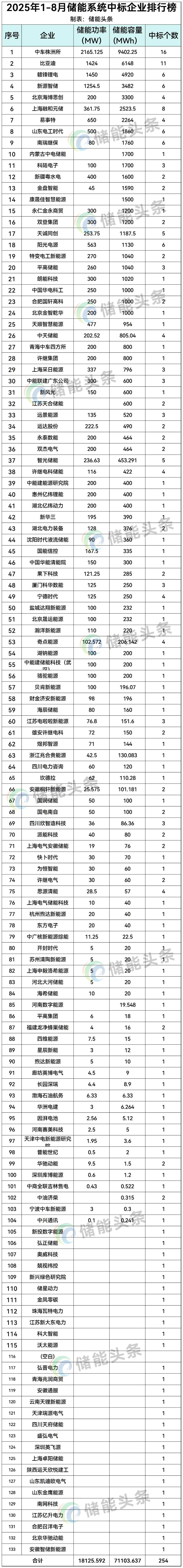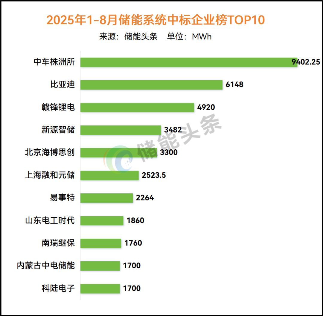储能头条根据储能系统中标公开信息统计:2025年1-8月份,中车株洲所中标9402.25MWh、 位列榜首;比亚迪中标6148MWh,列第二; 赣锋锂电中标4920MWh列第三; 紧接着是新源智储中标3482MWh、 北京海博思创中标3300MWh、 上海融和元储中标2523.5MWh、 易事特中标2264MWh、 山东电工时代中标1860MWh、 南瑞继保中标1760MWh、 内蒙古中电储能中标1700MWh、 科陆电子中标1700MWh分别位列2025年1-8月储能系统中标榜前十。(注:此数据统计中不包括集采未分配份额)