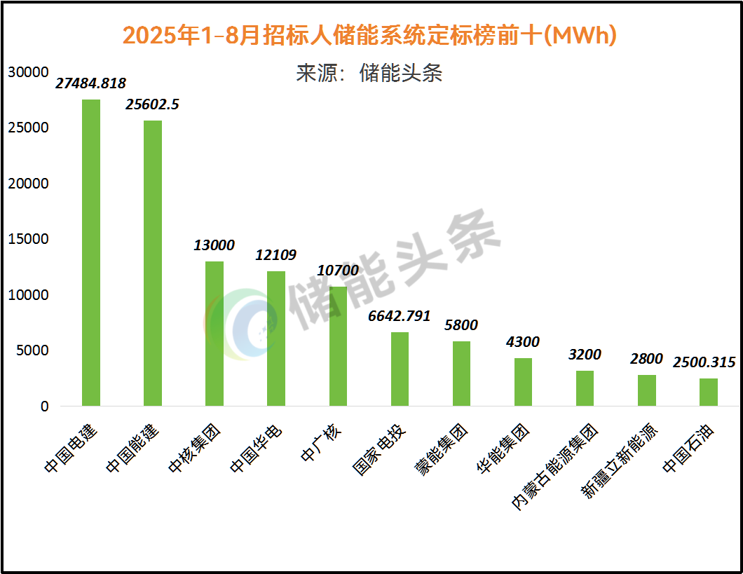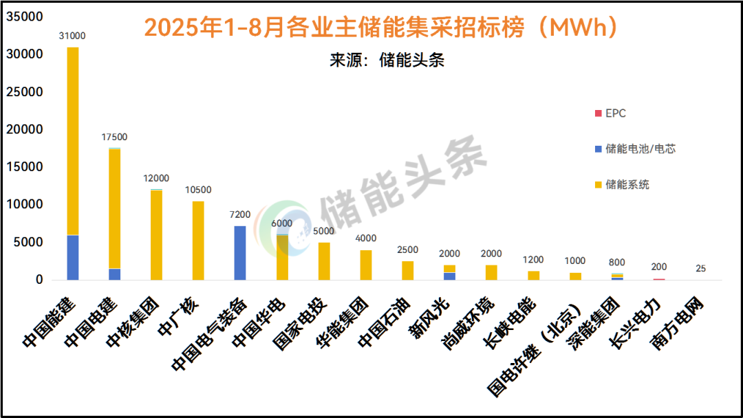 2025年1-8月完成储能系统集采的招标人有中国能建、中国电建、中核集团、中广核、华电、华能、中国石油、尚威环境、新风光、南方电网等企业,规模为86.725GWh 累计完成16000MWh储能电池集采工作 规模至少200MWh储能EPC框架招标