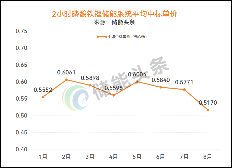 磷酸铁锂储能中标单价,8月2h储能系统平均中标单价为0.517元/Wh,比