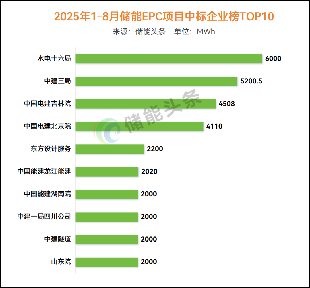 在储能系统中标规模排行榜中,中车株洲所、比亚迪、赣锋锂电位居前三;在储能项目EPC中标排行榜中,水电十六局、中建三局、中国电建吉林院(含牵头中标项目)分别列前三。