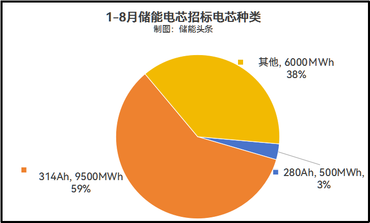 1-8月储能电芯公开招标的数量较少,多以直接采购为主。据电芯公开中标不完成统计,1-8月储能电芯招标16000MWh,其中采购以314Ah电芯为主,比例占到60%,280Ah电芯招标数量较少。