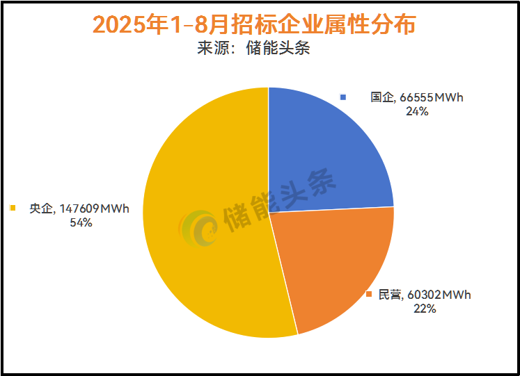 在定标规模上,根据储能头条不完全统计,2025年1-8月定标规模合计72.762GW/274.467GWh(含集采),其中,央企定标容量147.609GWh,占比为54%;国企开标66.555GWh,占比24%;民营企业开标60.702GWh,占22%;中国能建、中国电建、中国华电、中核集团、中广核、国家电投定标规模超10GWh。