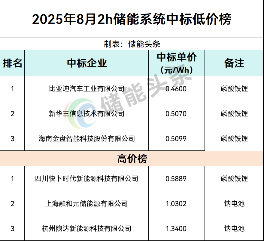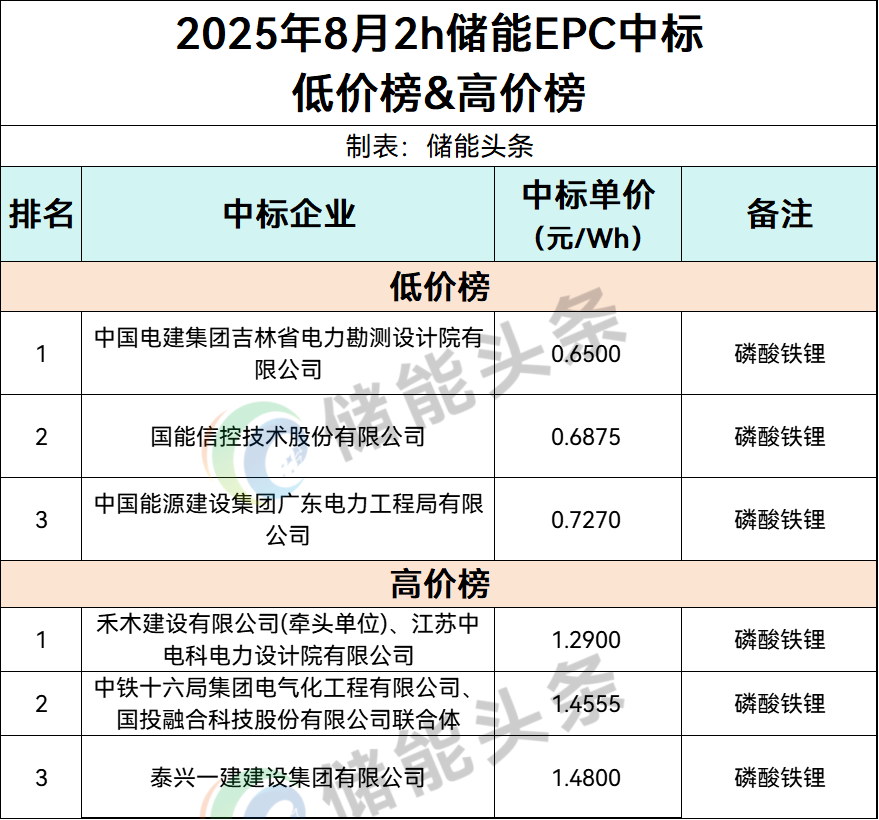 2h储能EPC项目中标低价Top3分别由中国电建吉林、国能信控、中国能建广东工程局投出。