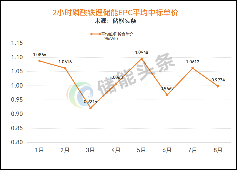 按月平均中标单价计算,1-8月份,2小时储能EPC平均中标单价处于0.9214-1.0948元/Wh范围之内。