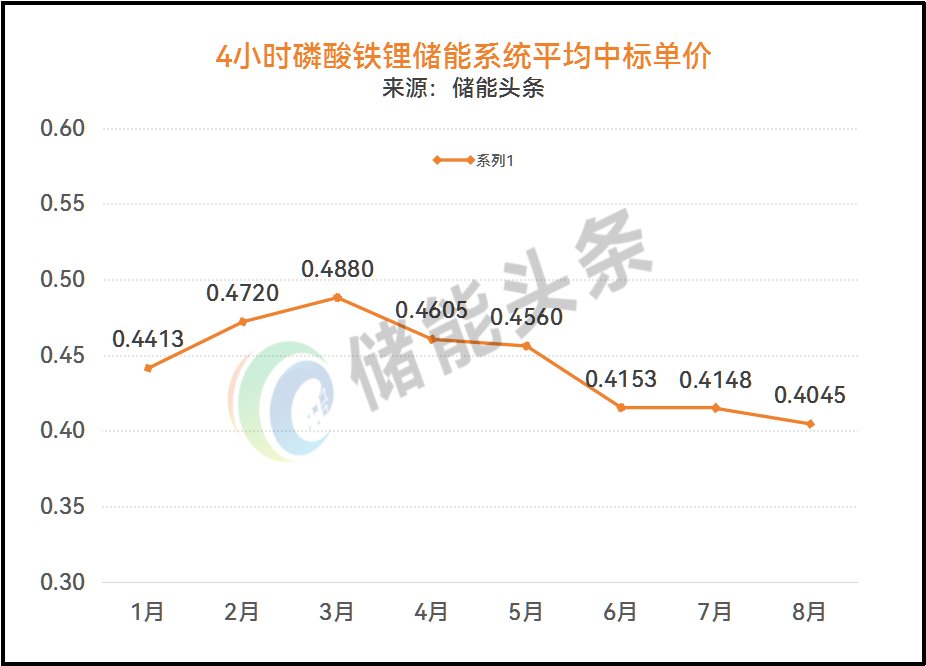 按月平均中标单价计算,1-8月,4小时储能系统平均中标单价处于0.4045-0.488元/Wh之间。