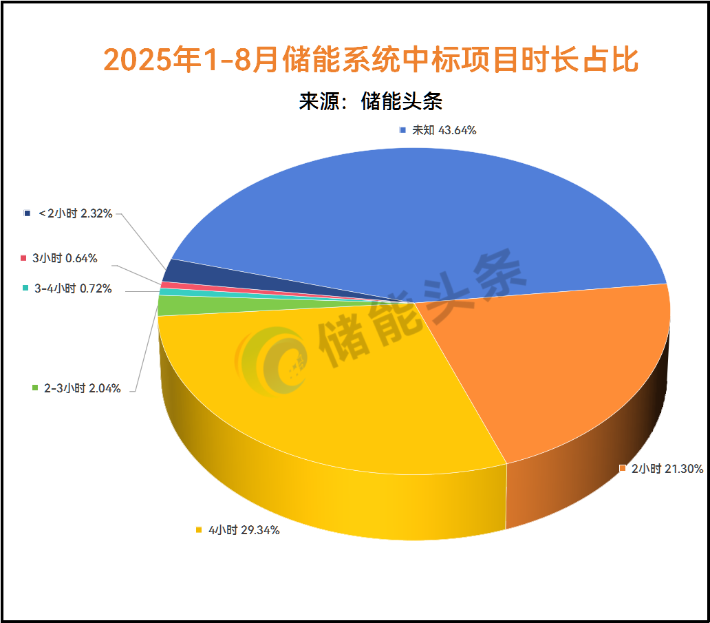 从储能时长来看,据储能头条统计,2025年1-8月储能系统采购项目中,2小时储能系统共涉16296.743MWh,占比16.94%;4小时储能系统共涉及15201MWh,占比15.80%;2-3小时储能时长共2818.201MWh,占比2.93%。