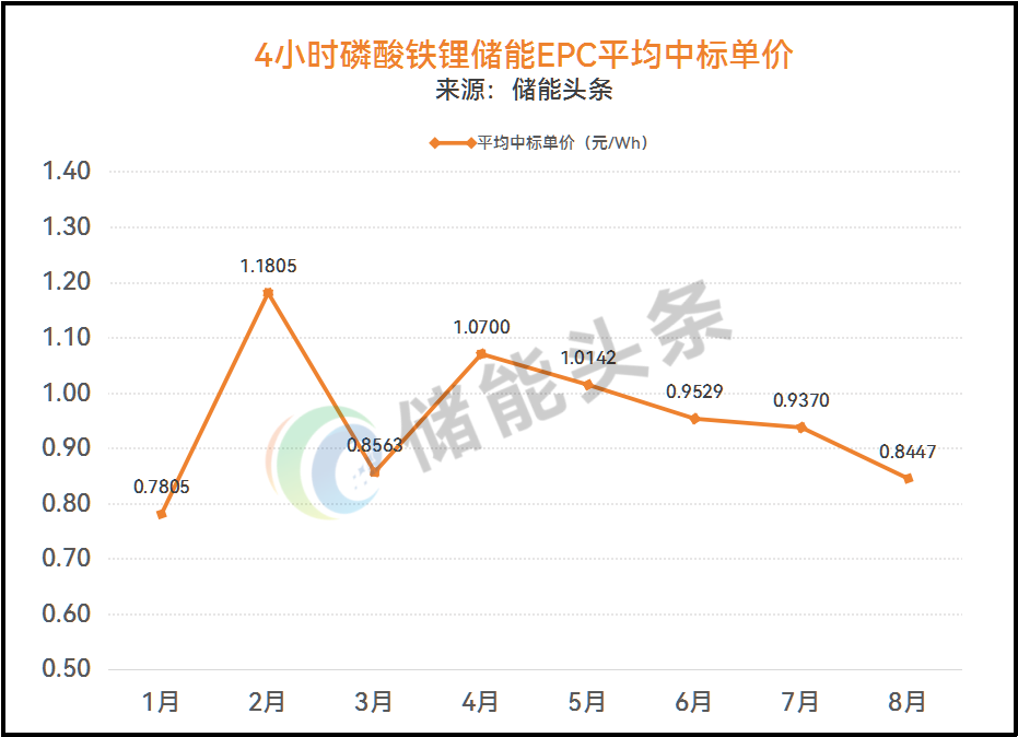 1-8月,4小时磷酸铁锂储能储能EPC中标单价在0.542~1.900元/Wh之间,均价为0.9452元/Wh。