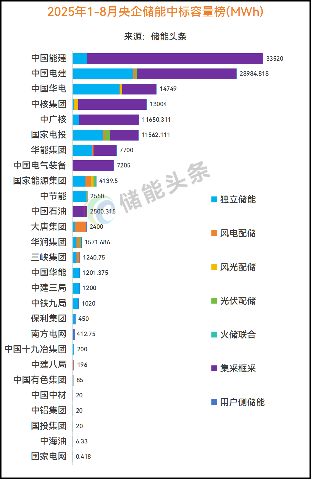 1-8月开标规模超100MW的央企有中国能建、中国电建、中国华电、中核集团、中广核、国家电投、华能集团、中国电气装备集团、国家能源集团、中节能、中国石油、大唐集团、华润集团、三峡集团、中国华能、中建三局、中铁九局、保利集团、南方电网、中国十九冶集团、中建八局等。其中: