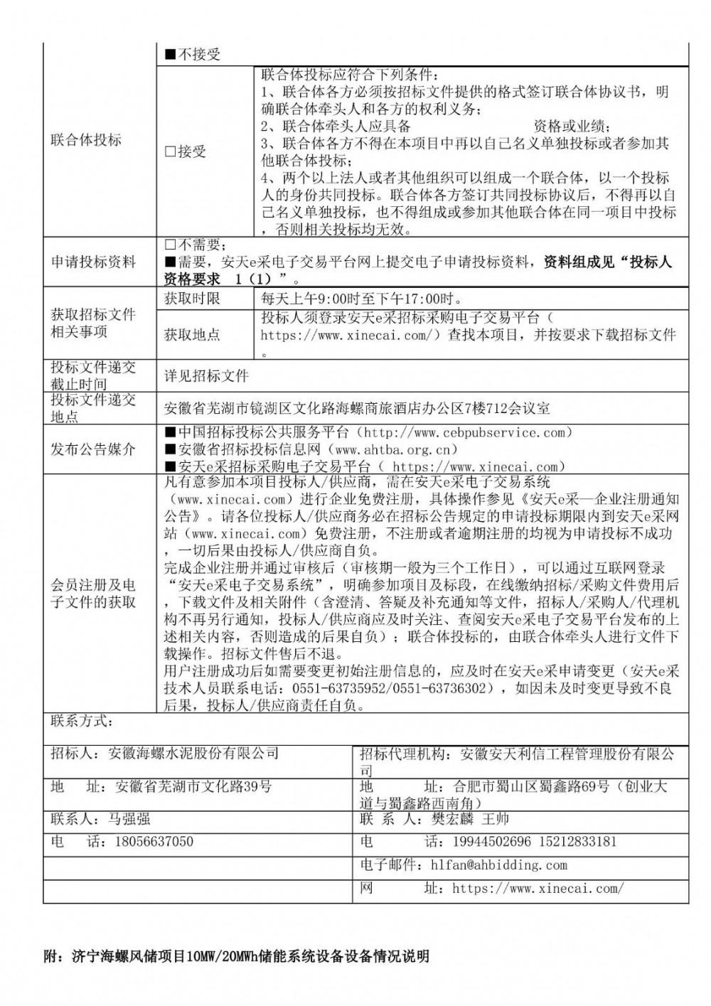 9月30日,济宁海螺风储项目10MW/20MWh储能系统设备招标公告发布。