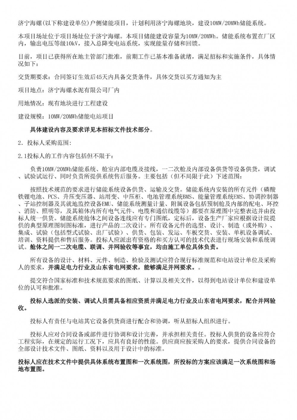 本项目场址位于项目场址位于济宁海螺。本项目储能建设容量为10MW/20MWh。储能系统布置在厂区内,输出电压等级10kV,接入总降变电站系统,实现能量存储和回馈。