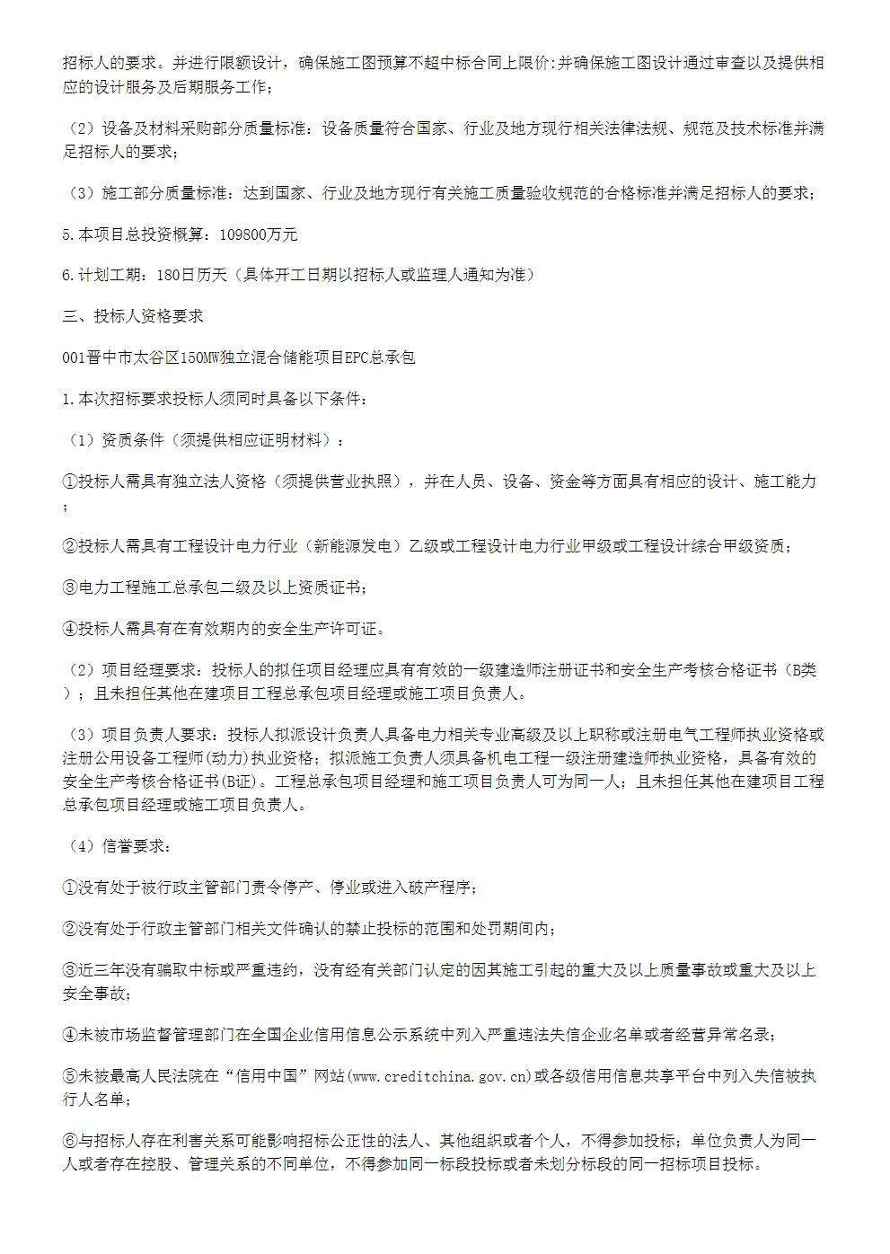 9月30日,晋中市太谷区150MW独立混合储能项目EPC总承包招标公告发布。
