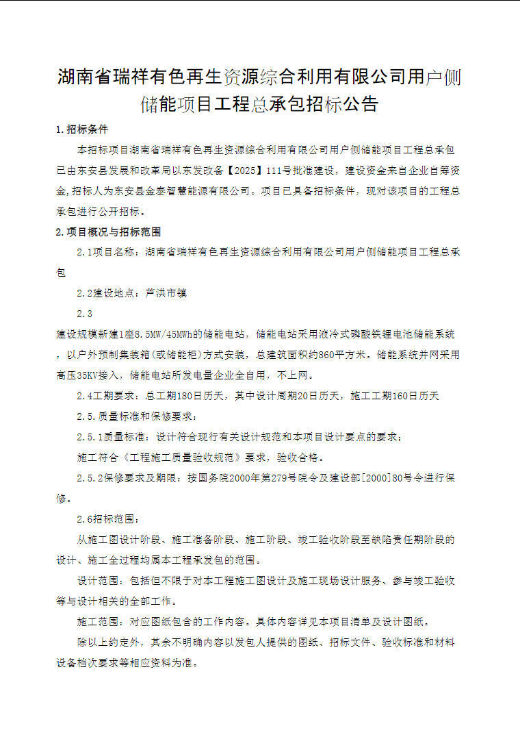 9月30日,湖南省瑞祥有色再生资源综合利用有限公司用户侧储能项目工程总承包招标公告发布。