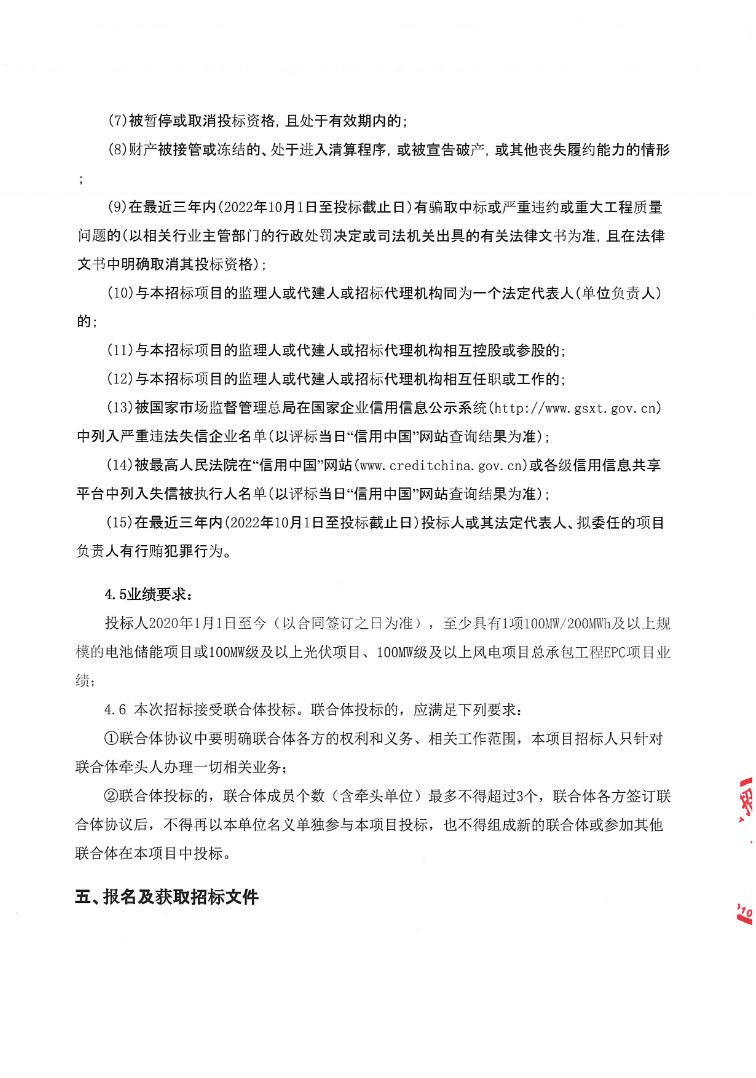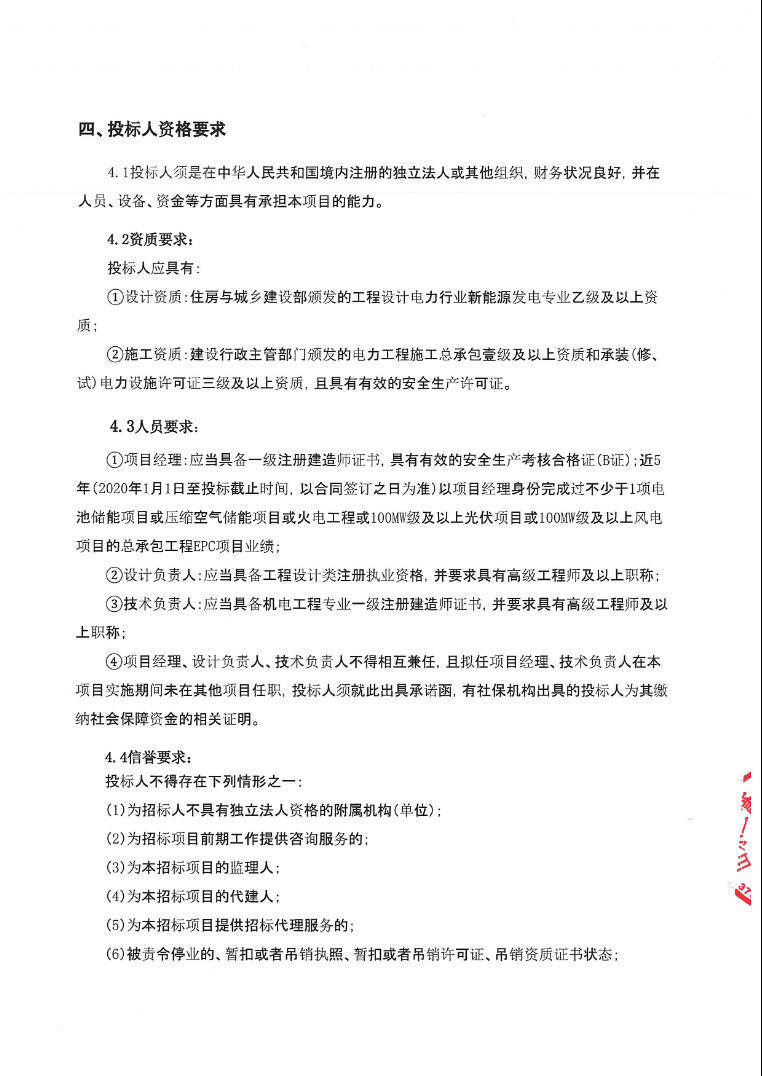投标人2020年1月1日至今(以合同签订之日为准),至少具有1项100MW/200MWh及以上规模的电池储能项目或100MW级及以上光伏项目、100MW级及以上风电项目总承包工程EPC项目业绩。