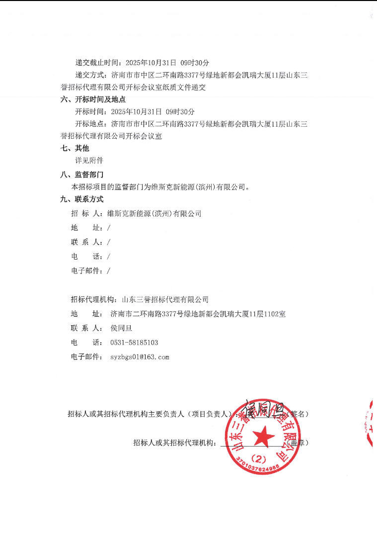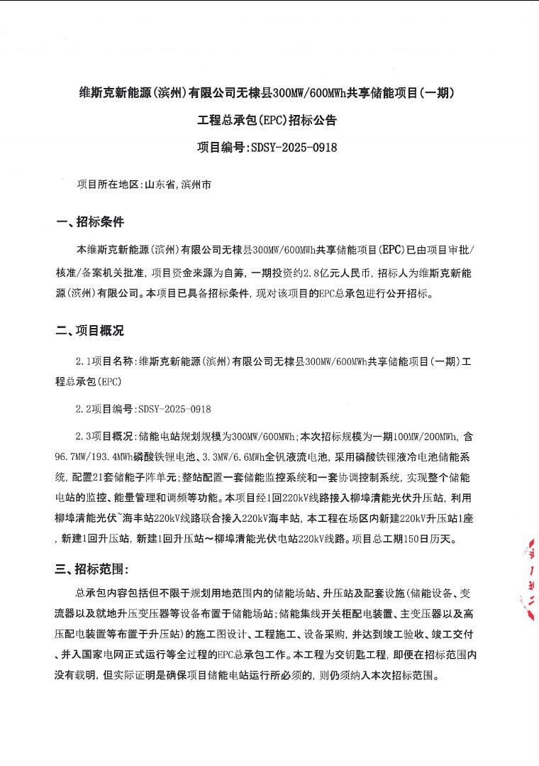 9月30日,维斯克新能源(滨州)有限公司无棣县300MW/600MWh共享储能项目(一期)工程总承包(EPC)招标公告发布。