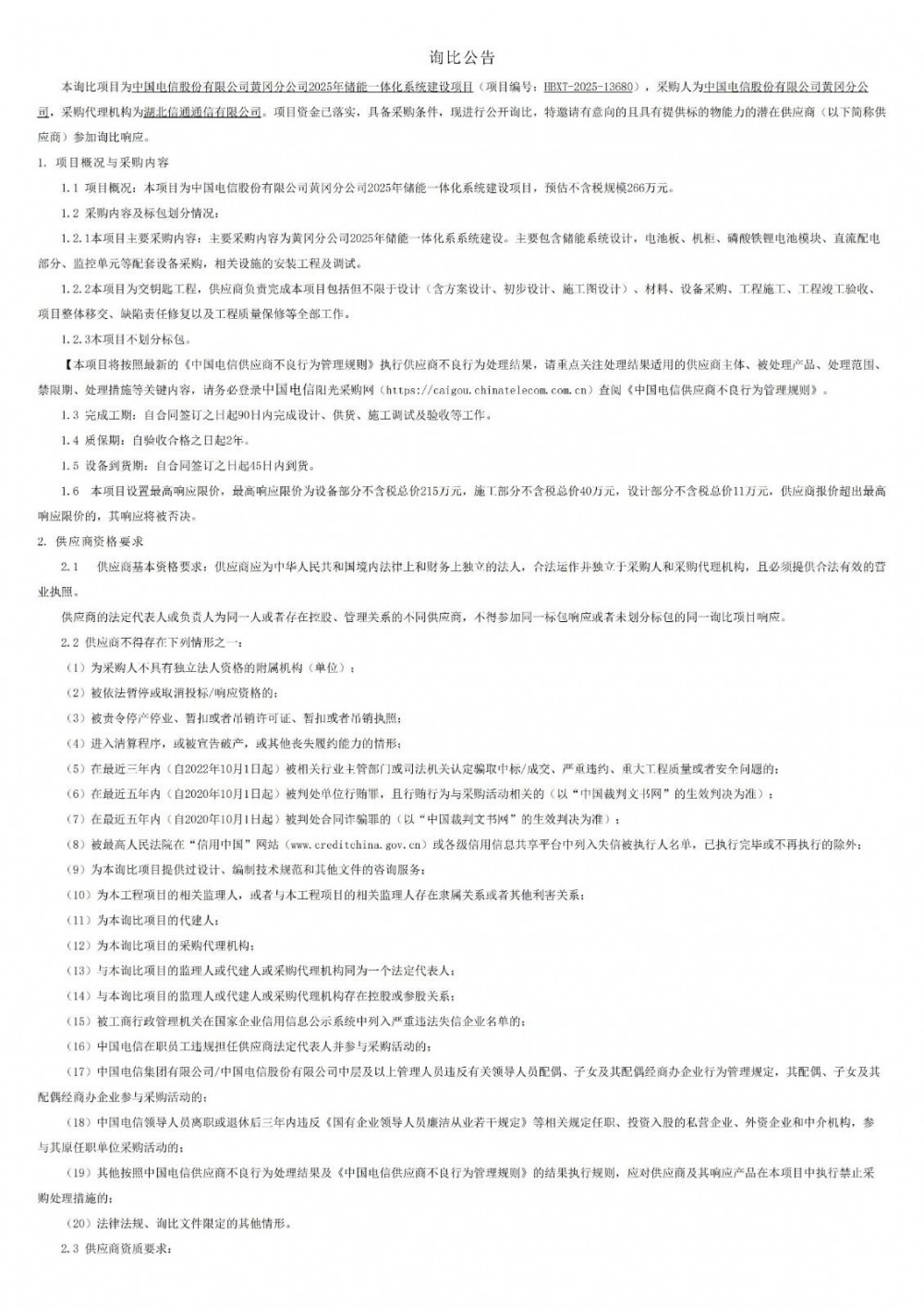 10月10日,中国电信股份有限公司黄冈分公司2025年储能一体化系统建设项目询比公告发布。