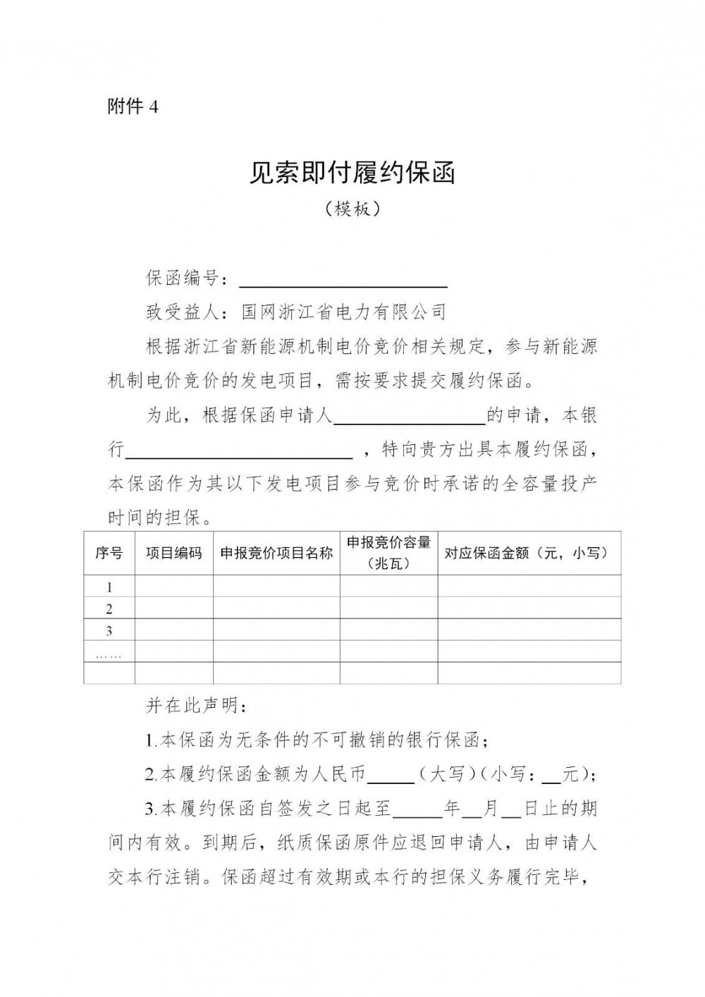 (二)履约保函。拟参与竞价的未投产项目(含未取得电力业务许可证项目)需向竞价组织机构提交履约保函(模板见附件4),已投产项目(需取得电力业务许可证)参与竞价的原则上不需提交保函。履约保函为银行出具的、向竞价组织机构开立的书面信用担保凭证,保函有效期为项目承诺投产时间1年后。