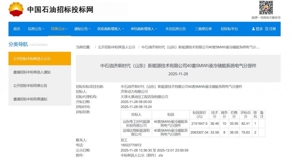 11月29日,中石油济柴时代(山东)新能源技术有限公司40套5MWh液冷储能系统电气分部件中标候选人发布,第1中标候选人为盐城达翔新能源有限公司,第2中标候选人为山东电工时代能源科技有限公司。