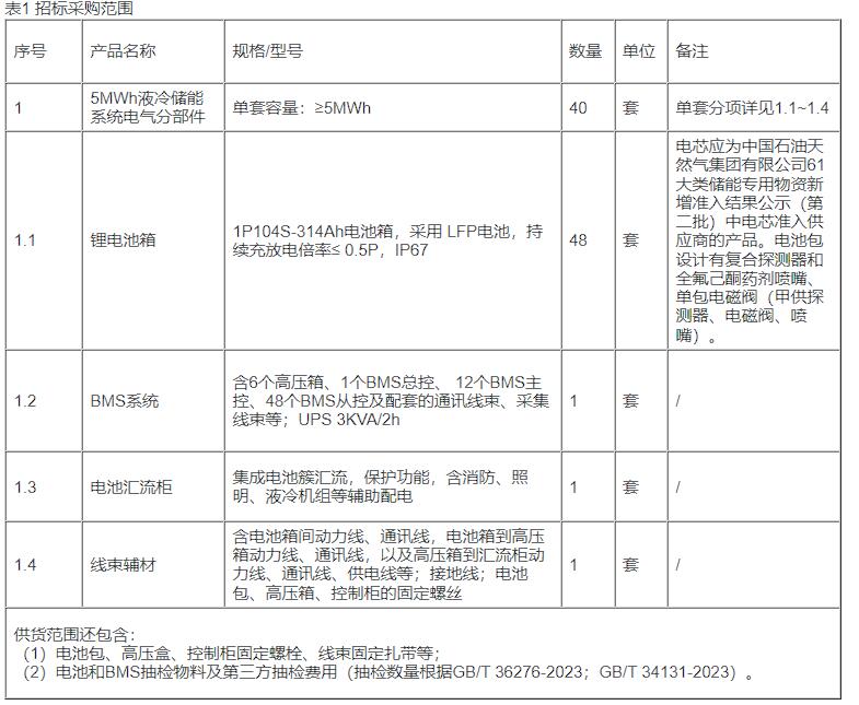 据此前的招标公告显示,项目为中石油济柴时代(山东)新能源技术有限公司40套5MWh液冷储能系统电气分部件采购招标,招标范围包括40套5MWh液冷储能系统电气分部件,招标采购范围详见表1和表2。本项目采购预算8330万元,含税。
