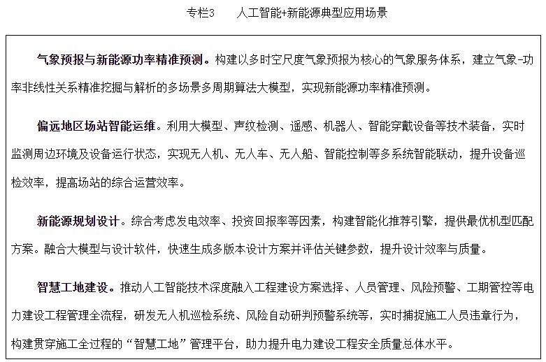文件特别提出,人工智能+新能源典型应用场景。针对新能源出力波动性与间歇性的问题,加快在高精度功率预测、电力市场、场站智慧运营、新能源规划、项目后评价等方向的人工智能应用,持续推动新能源关键材料及产品不断迭代和创新,推动复杂场景及转折性天气下功率预测大模型在更小尺度、更高精准度方向发展,支撑广域新能源资源协同优化,促进偏远地区新能源场站智能运维发展,打造“气象预测+功率预测+智慧交易+智能运维”一体化新能源智能生产模式,全力支撑新能源稳定供给。