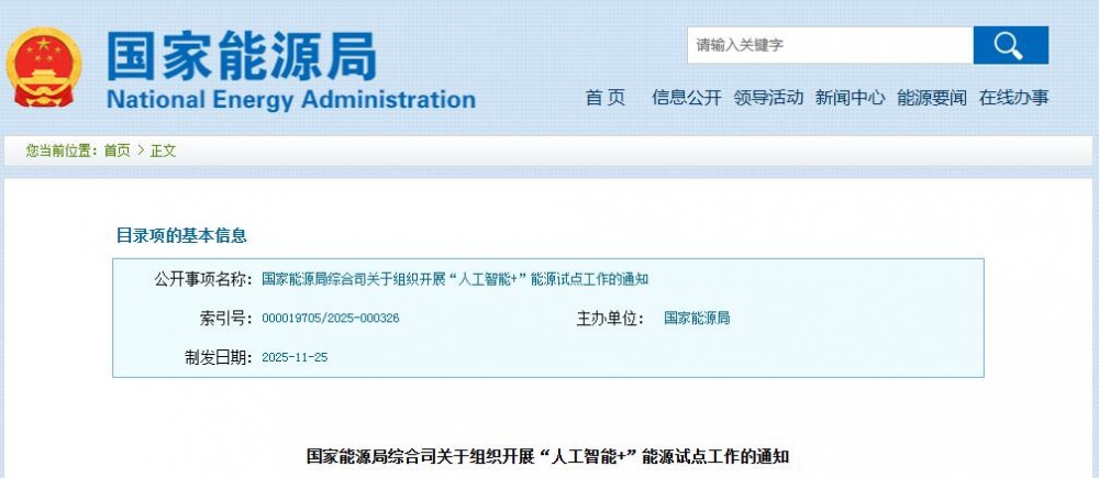 文件指出,为深入贯彻党中央、国务院关于发展人工智能的决策部署,落实《国家发展改革委 国家能源局关于推进“人工智能+”能源高质量发展的实施意见》(国能发科技〔2025〕73号,以下简称《实施意见》)有关工作要求,充分发挥我国能源领域超大规模市场和丰富应用场景优势,加快推动能源领域人工智能应用,拟组织开展“人工智能+”能源试点工作。
