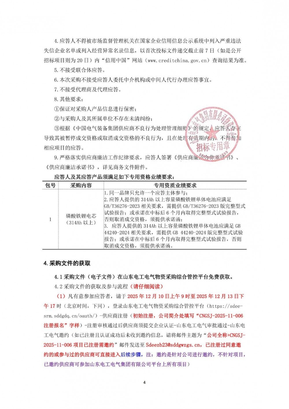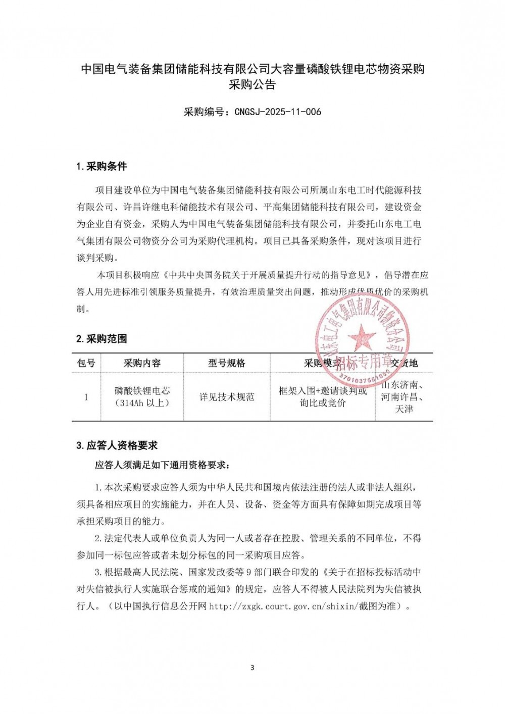 本次采购314Ah以上电芯,通过框架入围+邀请谈判或询比或竞价。